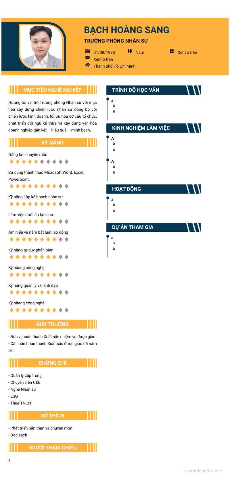 Mở xem thông tin đầy đủ ứng viên BẠCH HOÀNG SANG chỉ với 2 điểm. Ứng viên được cập nhật ngày 03/03/2026
