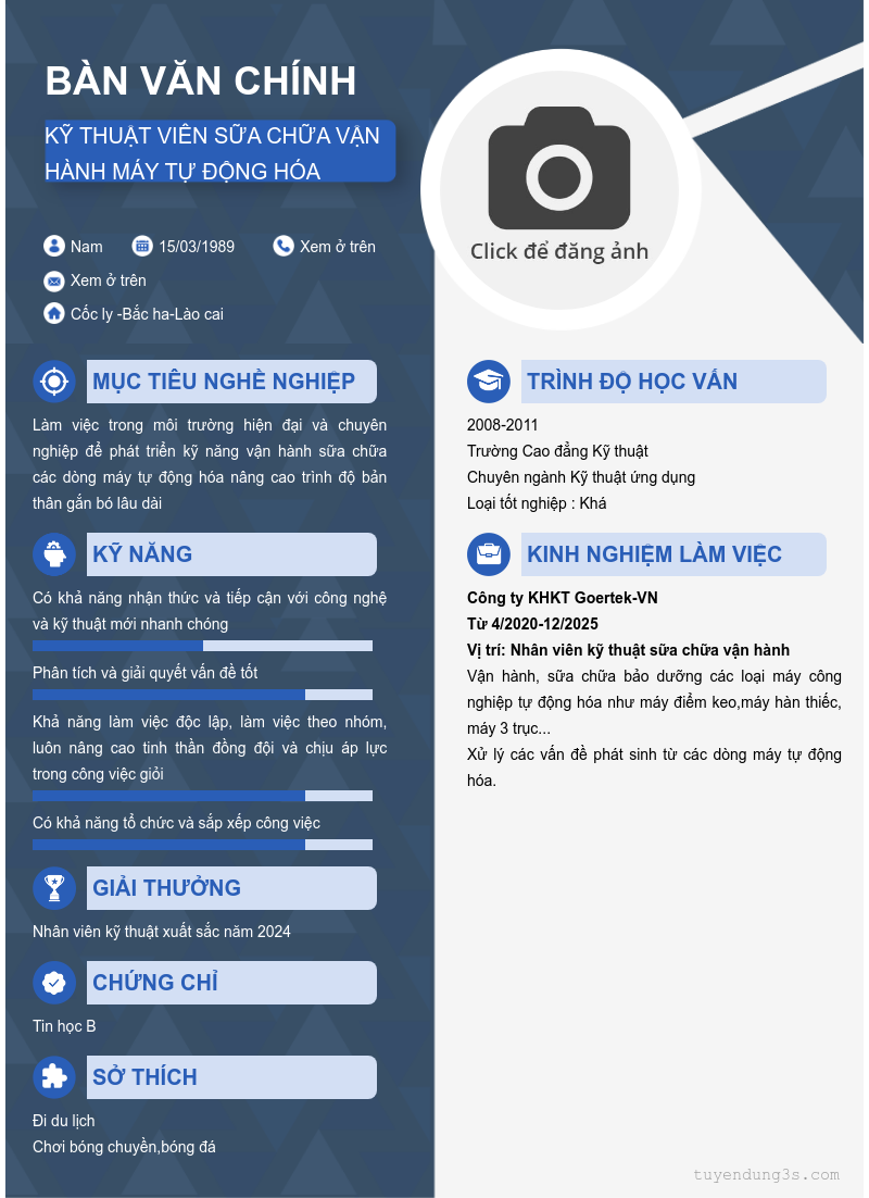 Vị trí: Kỹ thuật viên sữa chữa vận hành máy tự động hóa