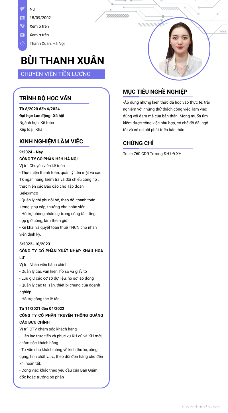 Mở xem thông tin đầy đủ ứng viên Bùi Thanh Xuân chỉ với 2 điểm. Ứng viên được cập nhật ngày 11/09/2025