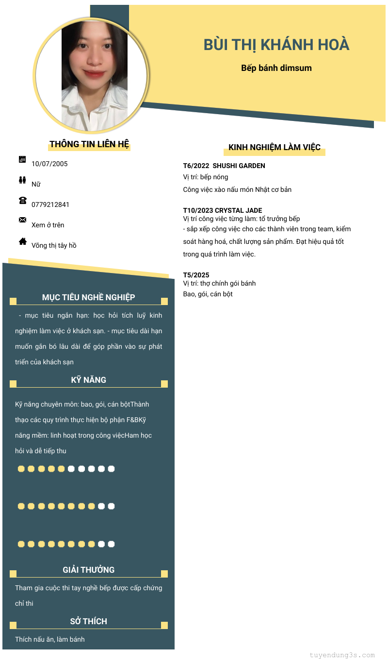 Mở xem thông tin đầy đủ ứng viên Bùi Thị Khánh Hoà chỉ với 2 điểm. Ứng viên được cập nhật ngày 22/10/2025
