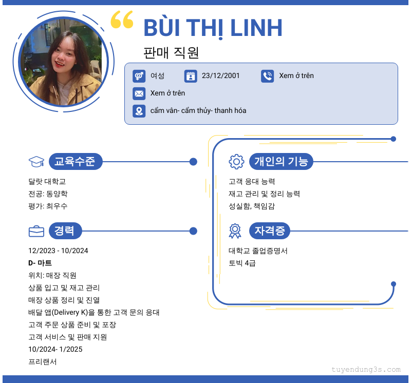 Mở xem thông tin đầy đủ ứng viên BÙI THỊ LINH chỉ với 2 điểm. Ứng viên được cập nhật ngày 22/01/2026