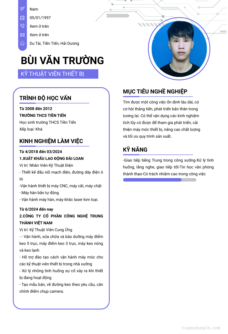 Mở xem thông tin đầy đủ ứng viên BÙI VĂN TRƯỜNG chỉ với 2 điểm. Ứng viên được cập nhật ngày 03/10/2025