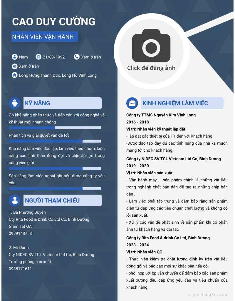 Mở xem thông tin đầy đủ ứng viên CAO DUY CƯỜNG chỉ với 2 điểm. Ứng viên được cập nhật ngày 22/12/2025
