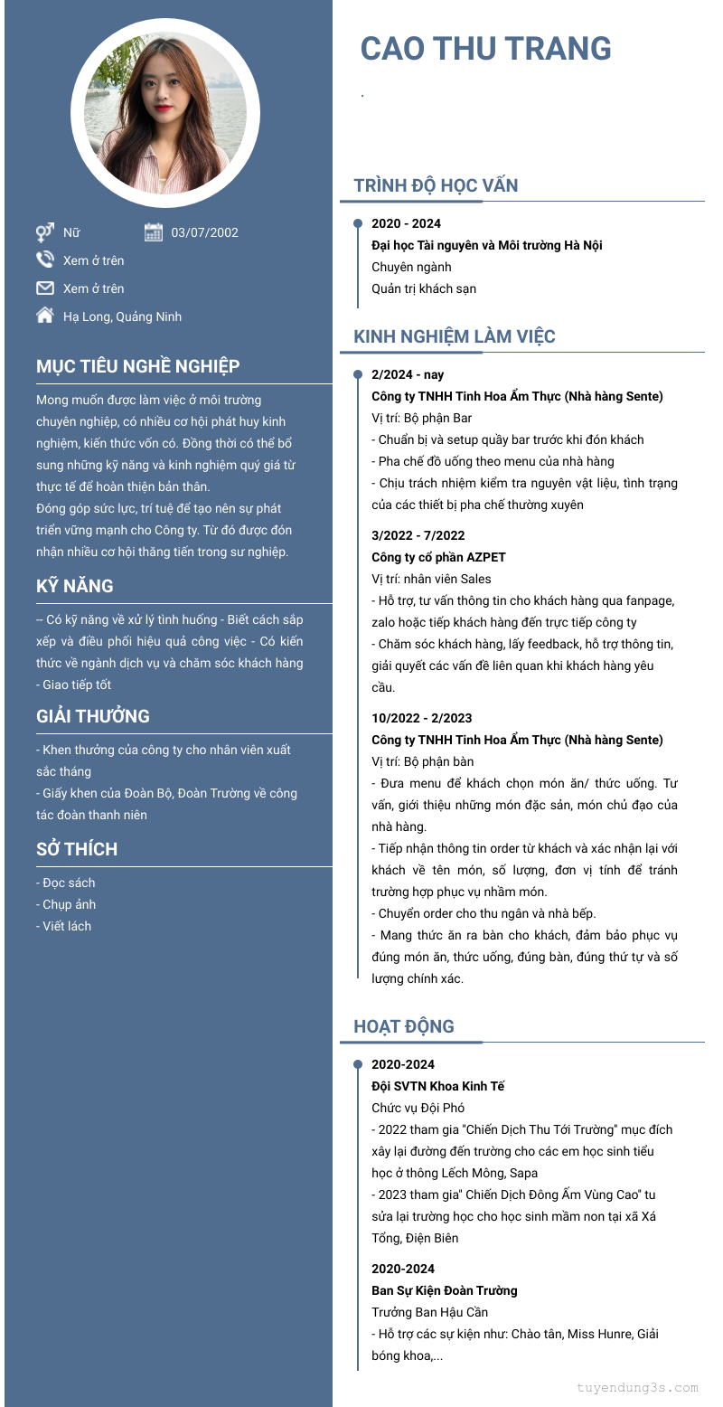 Mở xem thông tin đầy đủ ứng viên Cao Thu Trang chỉ với 2 điểm. Ứng viên được cập nhật ngày 22/07/2024