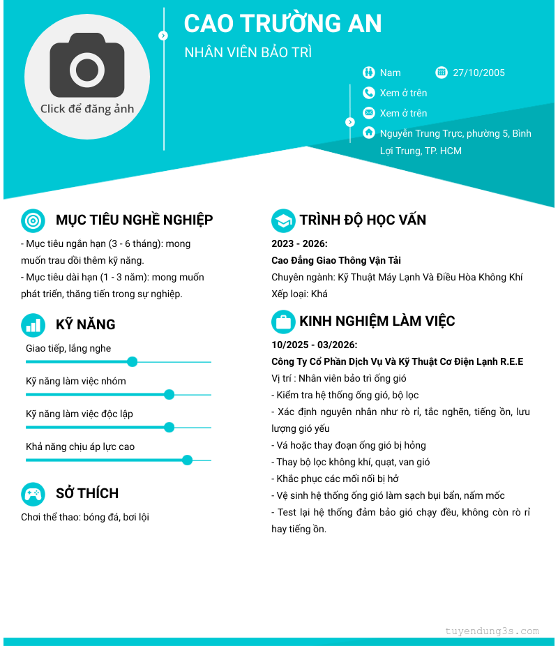 Mở xem thông tin đầy đủ ứng viên Cao Trường An chỉ với 2 điểm. Ứng viên được cập nhật ngày 28/04/2026
