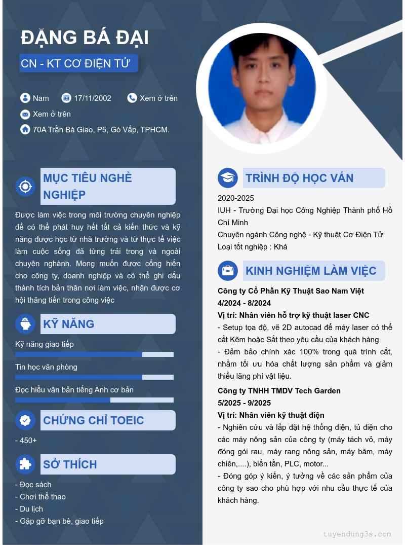 Mở xem thông tin đầy đủ ứng viên Đặng Bá Đại chỉ với 2 điểm. Ứng viên được cập nhật ngày 29/09/2025
