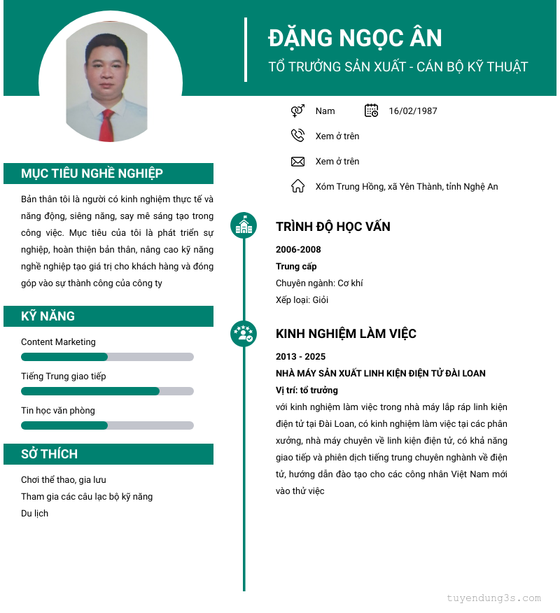 Nơi ở hiện tại: Xóm Trung Hồng, xã Yên Thành, tỉnh Nghệ An
