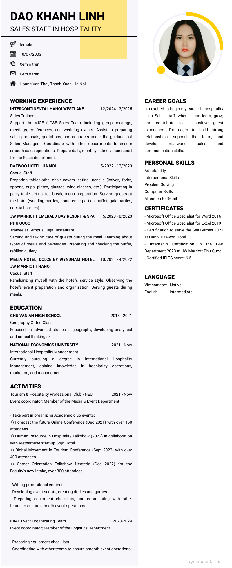Mở xem thông tin đầy đủ ứng viên Dao Khanh Linh chỉ với 2 điểm. Ứng viên được cập nhật ngày 13/11/2024