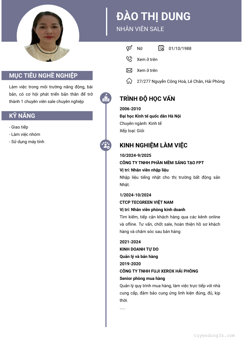 Mở xem thông tin đầy đủ ứng viên ĐÀO THỊ DUNG chỉ với 2 điểm. Ứng viên được cập nhật ngày 30/09/2025