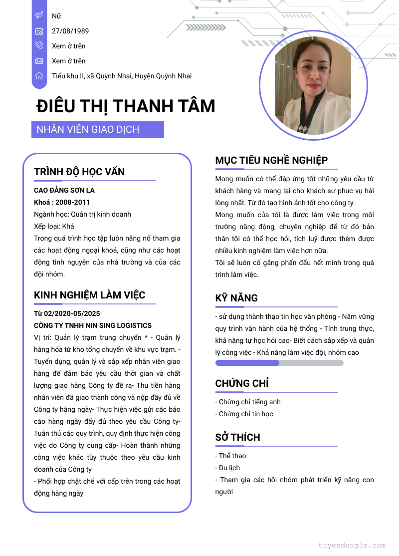 Mở xem thông tin đầy đủ ứng viên điêu Thị Thanh Tâm chỉ với 2 điểm. Ứng viên được cập nhật ngày 03/11/2025