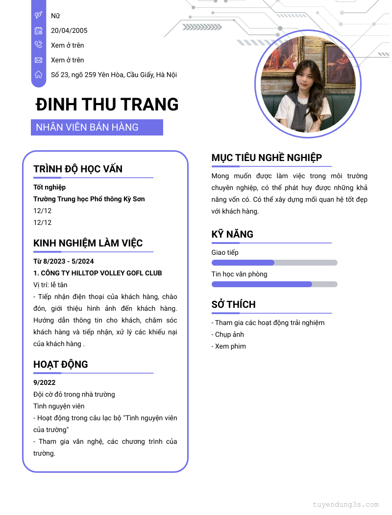 Mở xem thông tin đầy đủ ứng viên Đinh Thu Trang chỉ với 2 điểm. Ứng viên được cập nhật ngày 17/07/2024