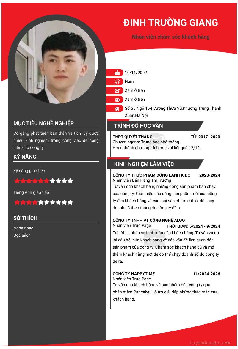 Mở xem thông tin đầy đủ ứng viên Đinh Trường Giang chỉ với 2 điểm. Ứng viên được cập nhật ngày 30/03/2026