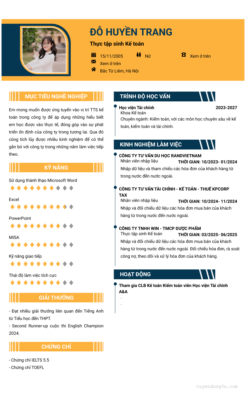 Mở xem thông tin đầy đủ ứng viên ĐỖ HUYỀN TRANG chỉ với 2 điểm. Ứng viên được cập nhật ngày 08/07/2024