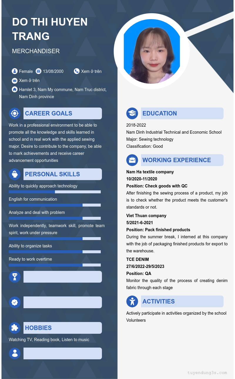 Nơi ở hiện tại: Hamlet 3, Nam My commune, Nam Truc district, Nam Dinh province