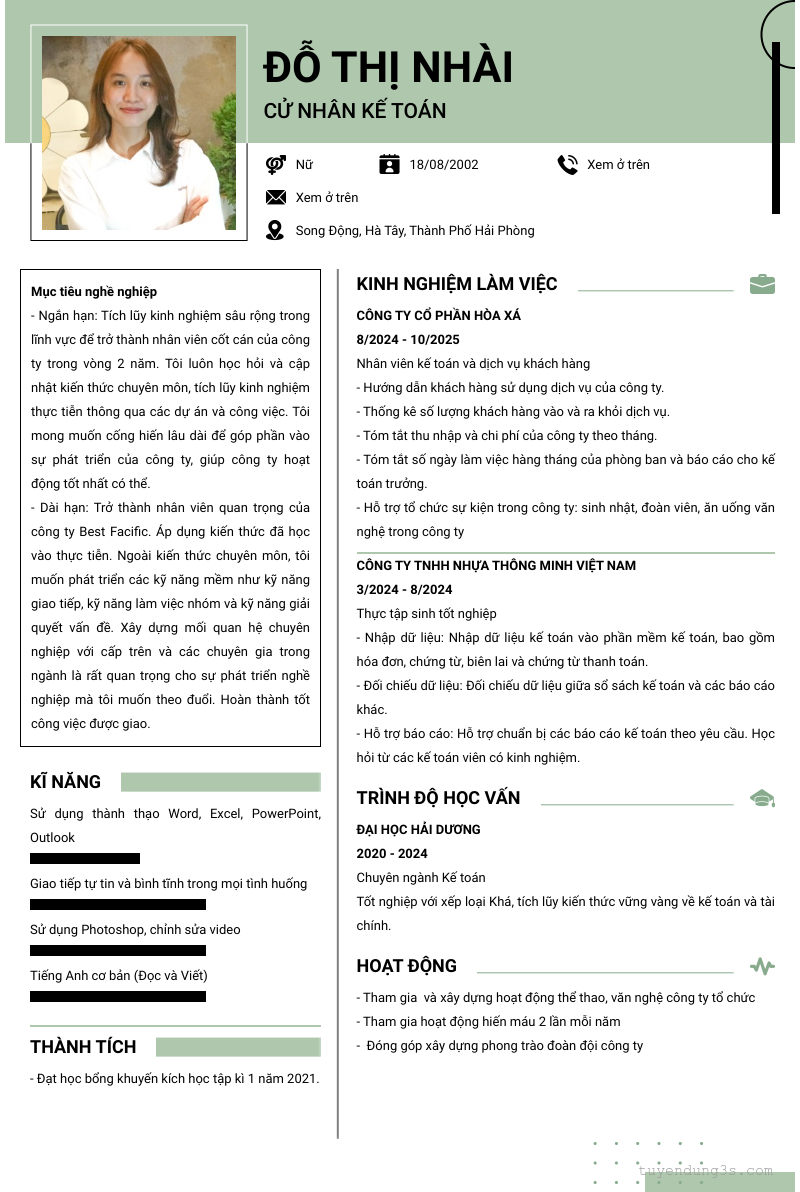 Mở xem thông tin đầy đủ ứng viên đỗ Thị Nhài chỉ với 2 điểm. Ứng viên được cập nhật ngày 08/12/2024