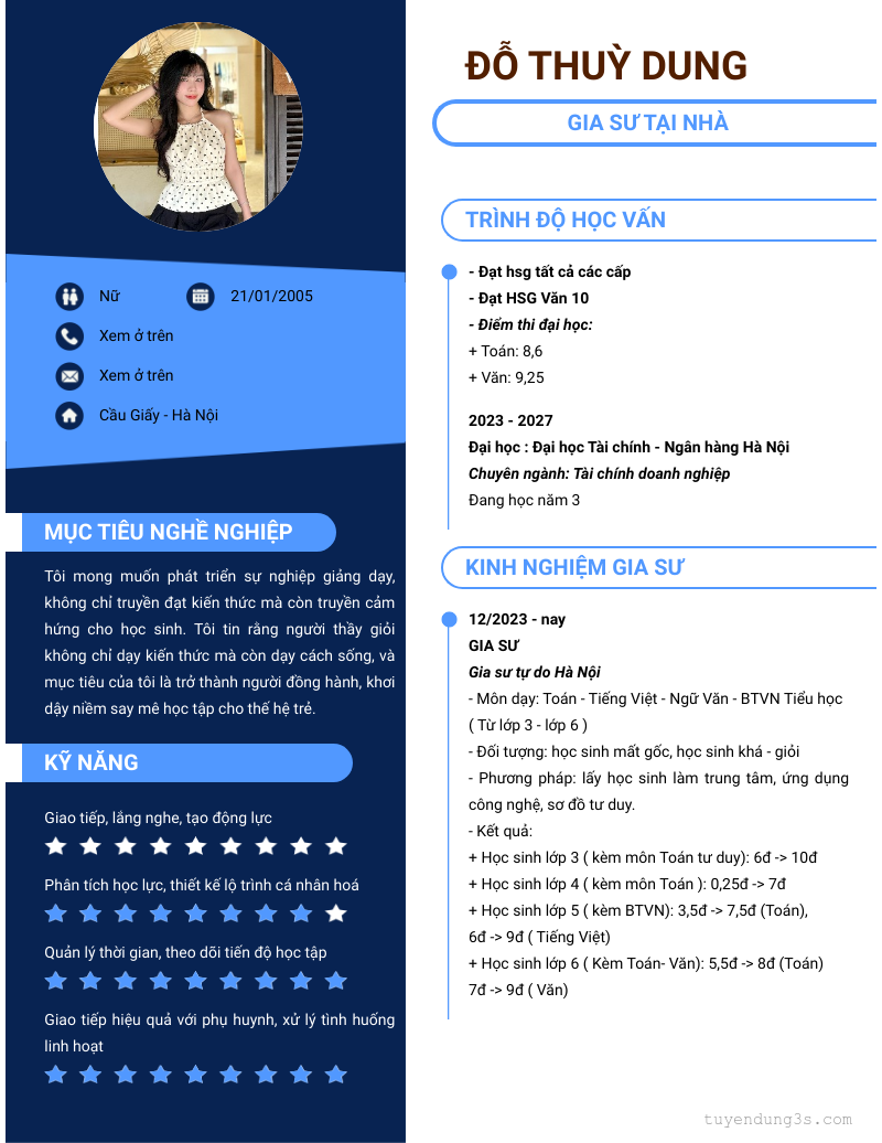 Mở xem thông tin đầy đủ ứng viên Đỗ Thuỳ Dung chỉ với 2 điểm. Ứng viên được cập nhật ngày 01/10/2025