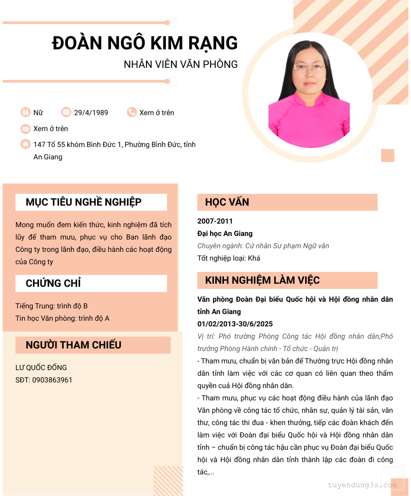 Nơi ở hiện tại: 147 Tổ 55 khóm Bình Đức 1, Phường Bình Đức, tỉnh An Giang