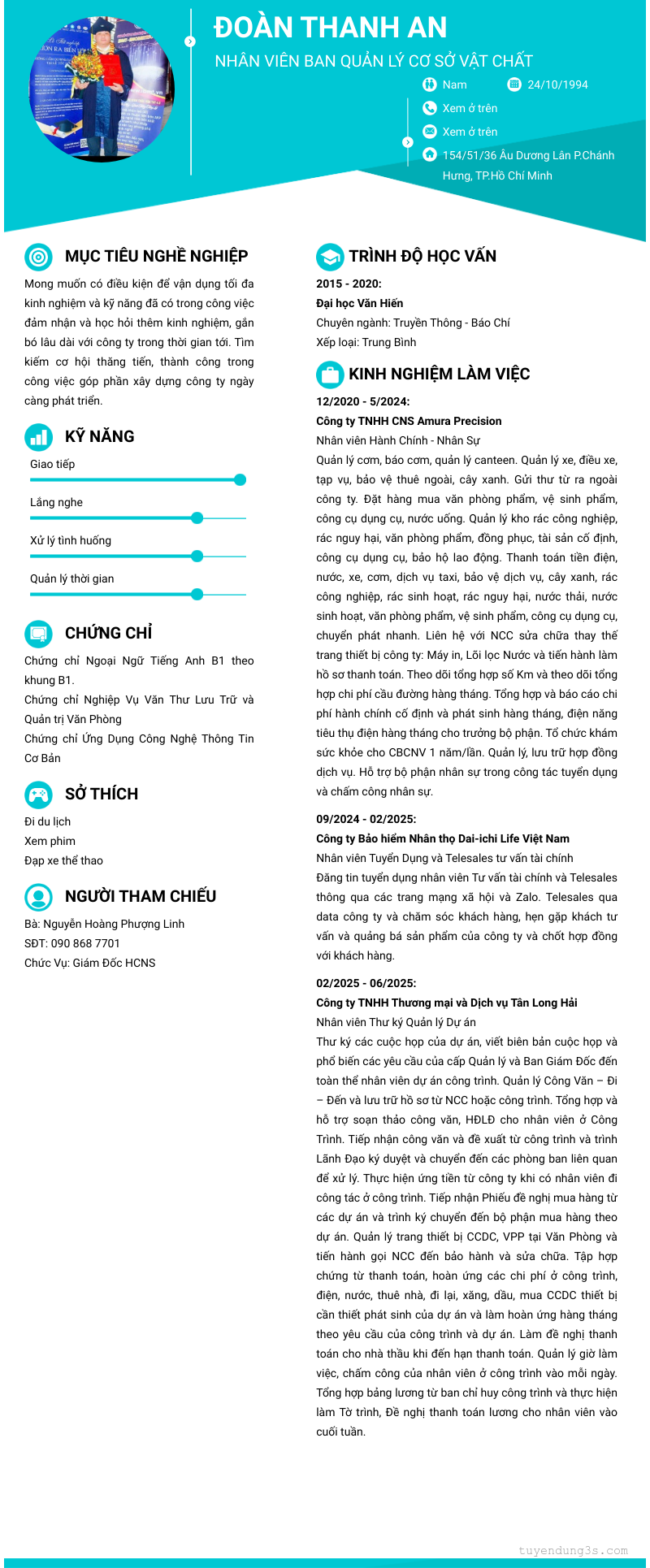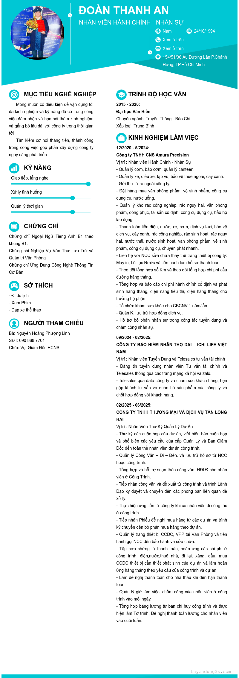 Mở xem thông tin đầy đủ ứng viên ĐOÀN THANH AN chỉ với 2 điểm. Ứng viên được cập nhật ngày 17/10/2025