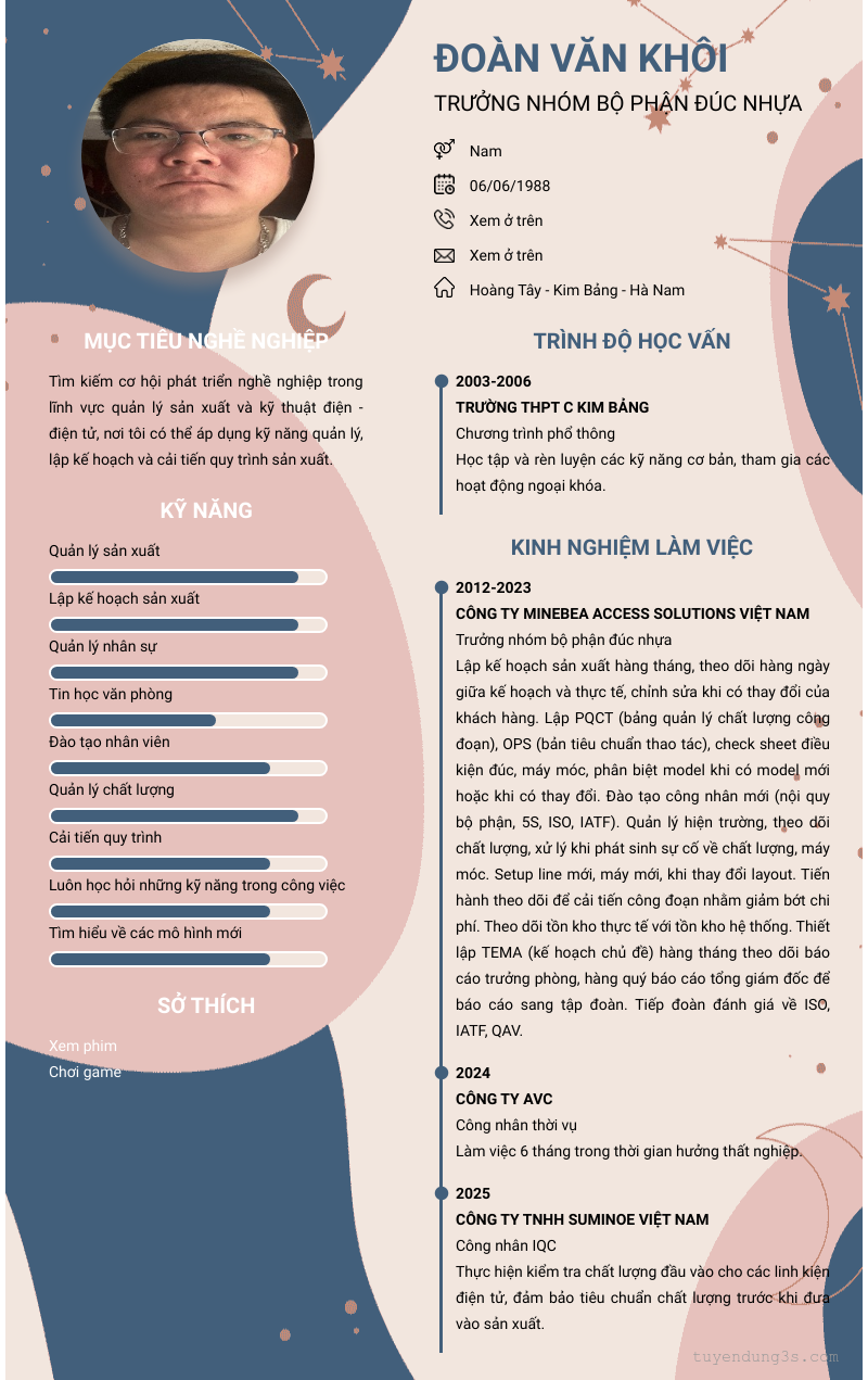 Mở xem thông tin đầy đủ ứng viên Đoàn Văn Khôi chỉ với 2 điểm. Ứng viên được cập nhật ngày 03/04/2025
