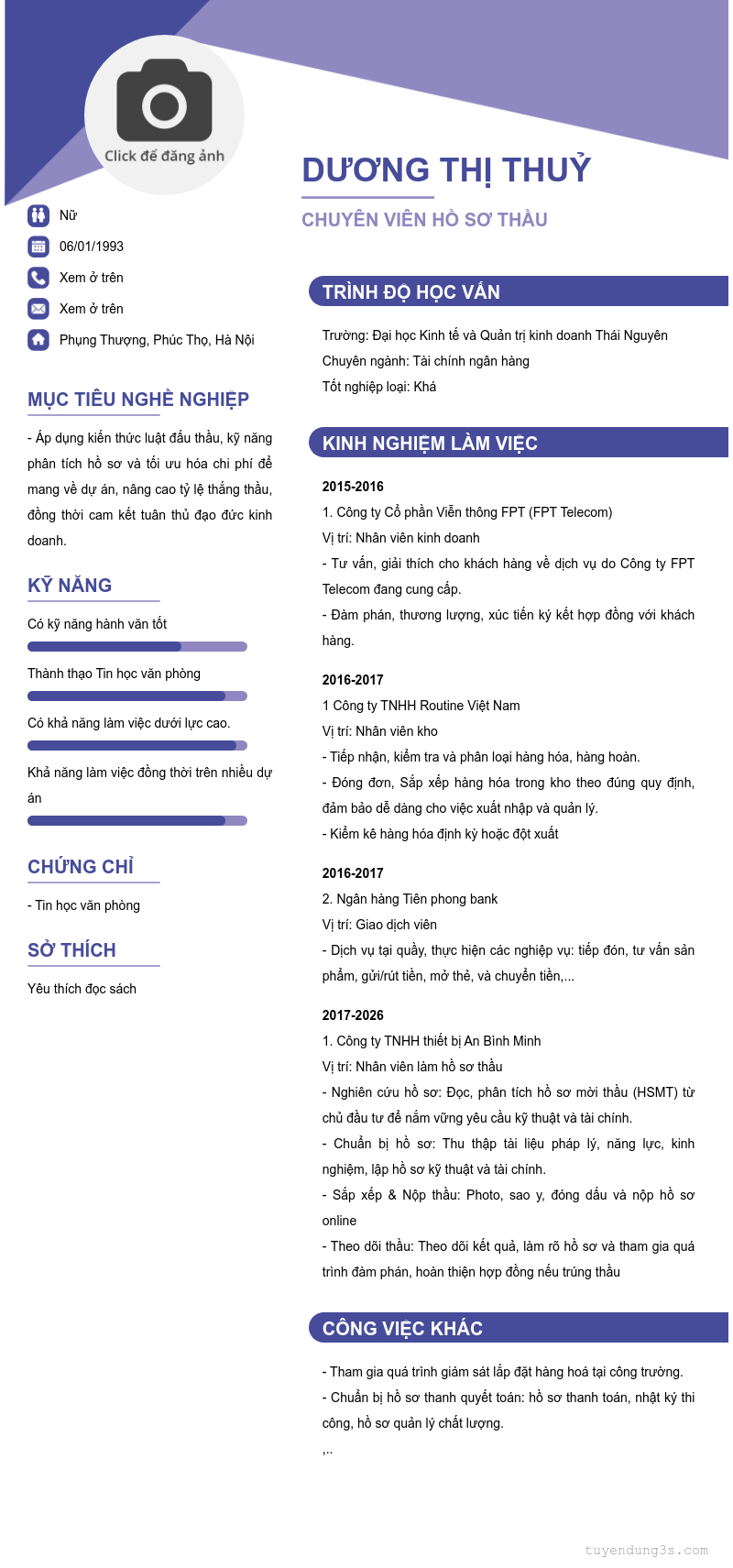 Mở xem thông tin đầy đủ ứng viên Dương Thị Thuỷ chỉ với 2 điểm. Ứng viên được cập nhật ngày 24/03/2026