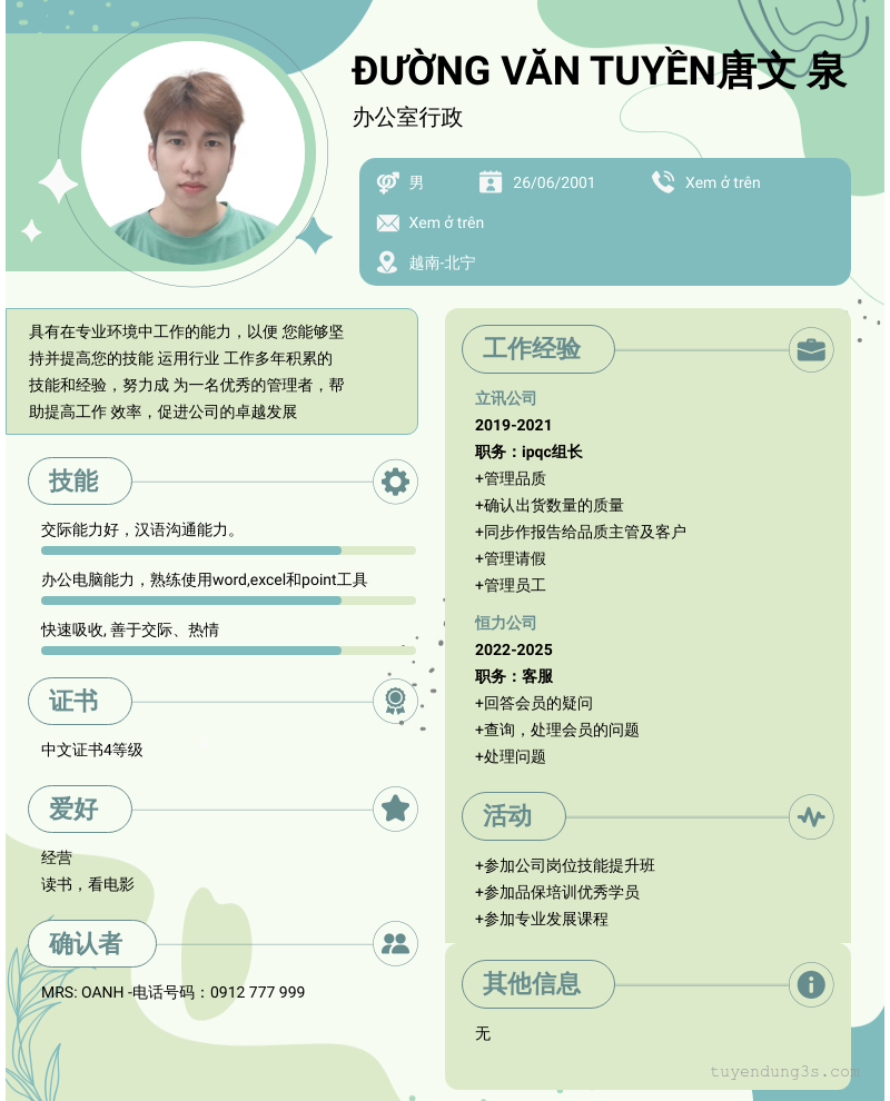 Mở xem thông tin đầy đủ ứng viên đường Văn Tuyền唐文 泉 chỉ với 2 điểm. Ứng viên được cập nhật ngày 23/09/2025