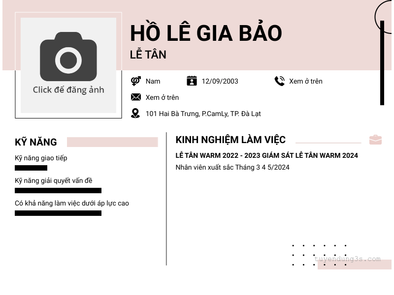 Mở xem thông tin đầy đủ ứng viên HỒ LÊ GIA BẢO chỉ với 2 điểm. Ứng viên được cập nhật ngày 12/03/2026