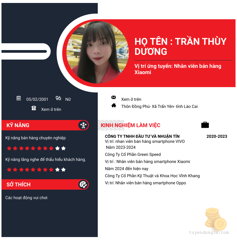 Mở xem thông tin đầy đủ ứng viên HỌ Tên : Trần Thùy Dương chỉ với 2 điểm. Ứng viên được cập nhật ngày 04/10/2025