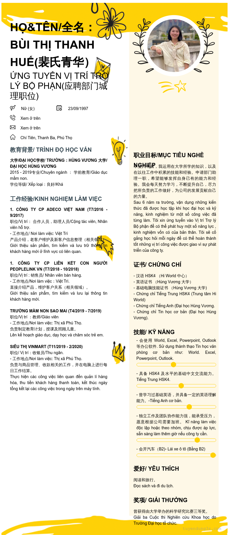 Mở xem thông tin đầy đủ ứng viên Họ&Tên/全名:bùi Thị Thanh Huế(裴氏青华) chỉ với 2 điểm. Ứng viên được cập nhật ngày 14/11/2025