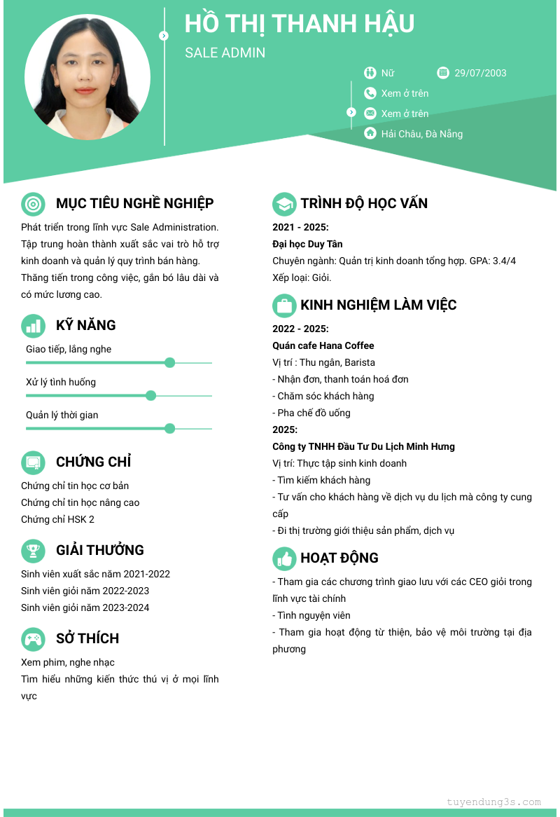 Mở xem thông tin đầy đủ ứng viên Hồ Thị Thanh Hậu chỉ với 2 điểm. Ứng viên được cập nhật ngày 09/01/2025