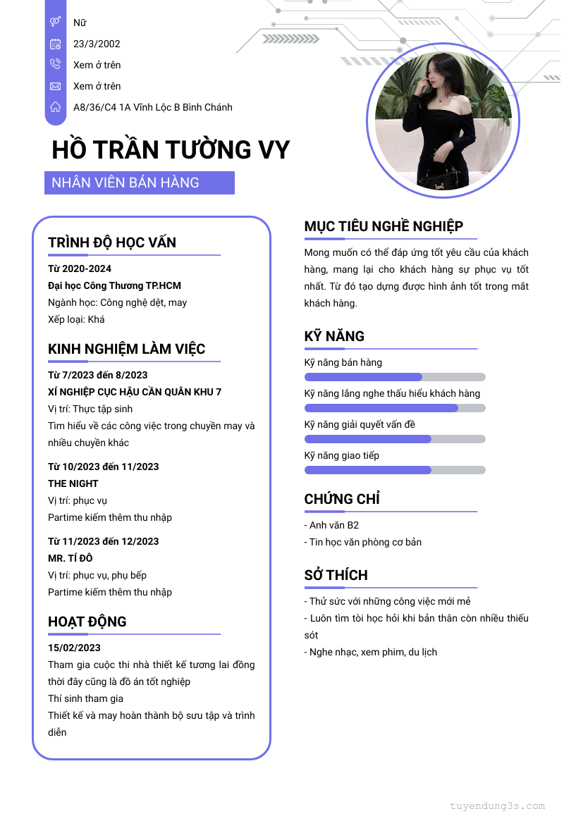 Mở xem thông tin đầy đủ ứng viên Hồ Trần Tường Vy chỉ với 2 điểm. Ứng viên được cập nhật ngày 01/06/2024