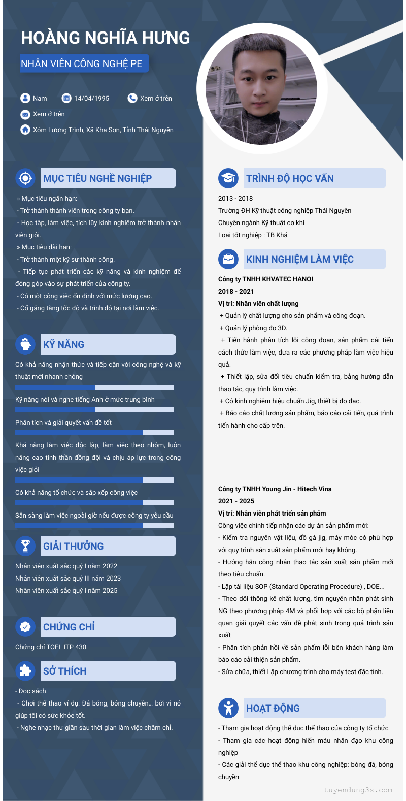 Mở xem thông tin đầy đủ ứng viên Hoàng Nghĩa Hưng chỉ với 2 điểm. Ứng viên được cập nhật ngày 19/09/2025