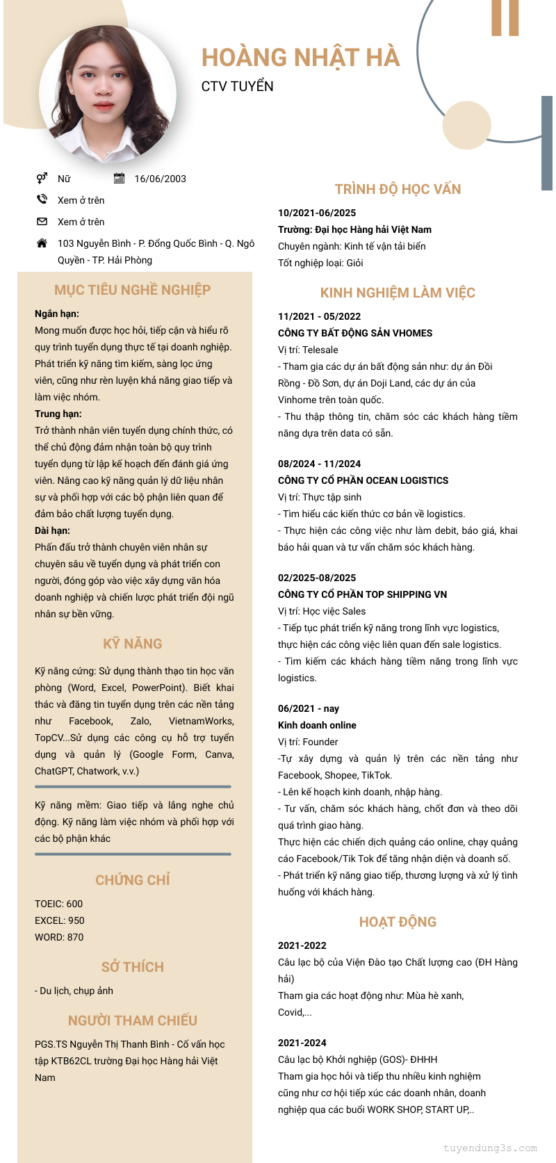 Nơi ở hiện tại: 103 Nguyễn Bình - P. Đổng Quốc Bình - Q. Ngô Quyền - TP. Hải Phòng