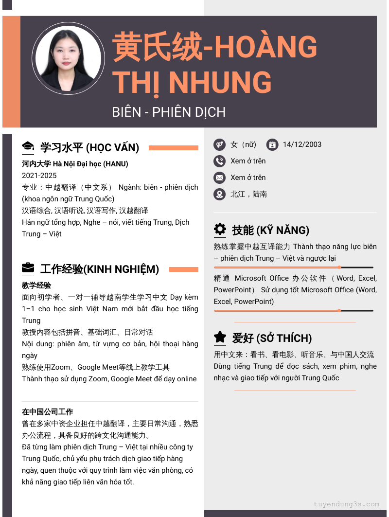 Mở xem thông tin đầy đủ ứng viên 黄氏绒-Hoàng Thị Nhung chỉ với 2 điểm. Ứng viên được cập nhật ngày 18/06/2025