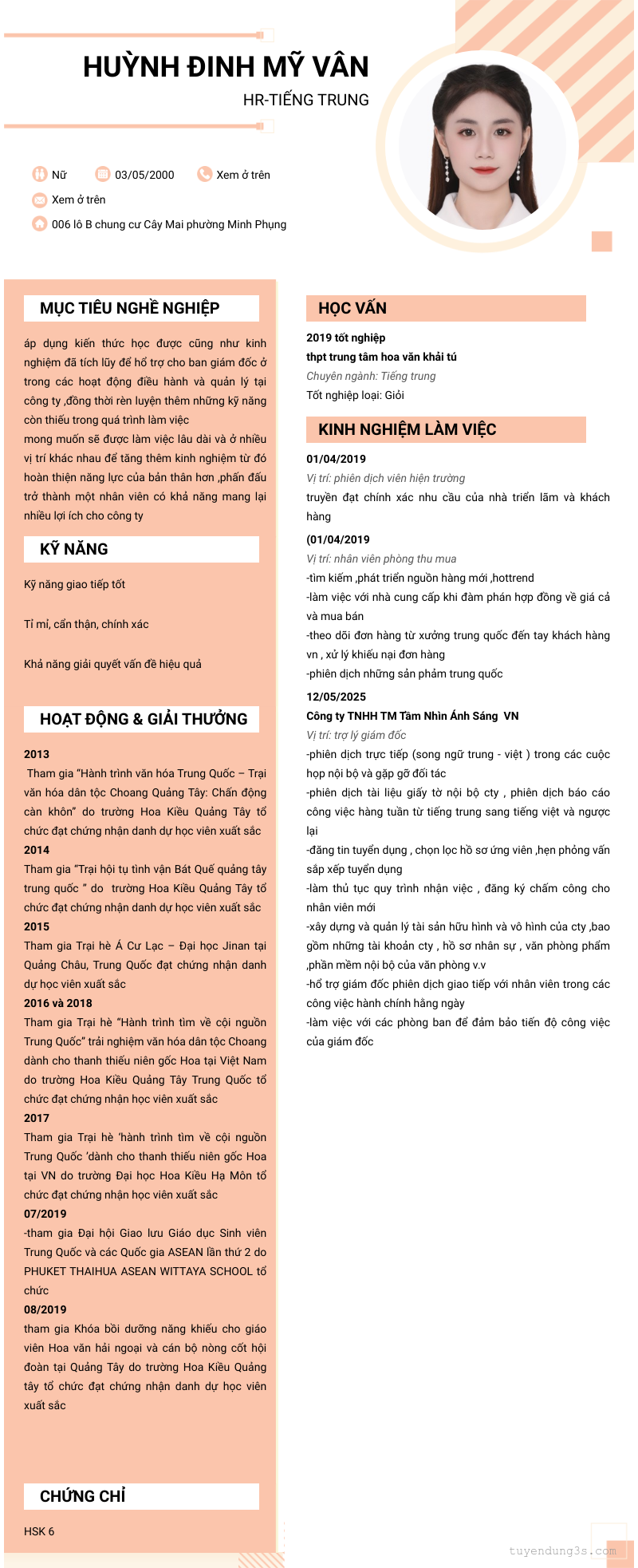 Mở xem thông tin đầy đủ ứng viên Huỳnh đinh Mỹ Vân chỉ với 2 điểm. Ứng viên được cập nhật ngày 24/09/2025