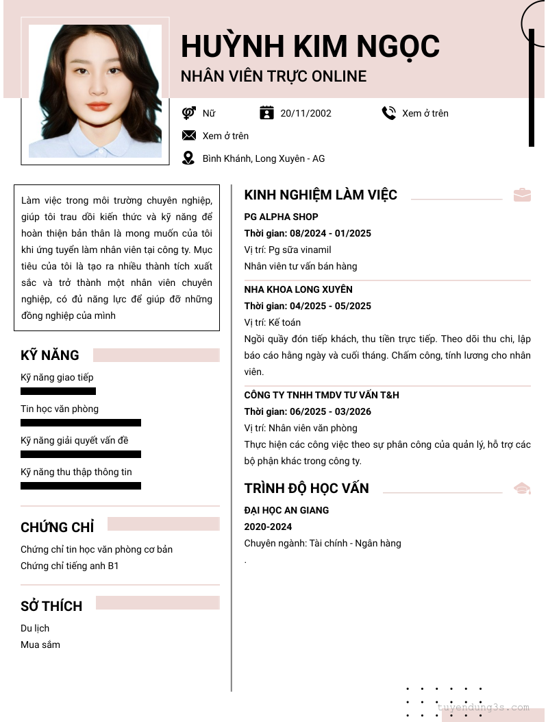Mở xem thông tin đầy đủ ứng viên Huỳnh Kim Ngọc chỉ với 2 điểm. Ứng viên được cập nhật ngày 04/04/2026
