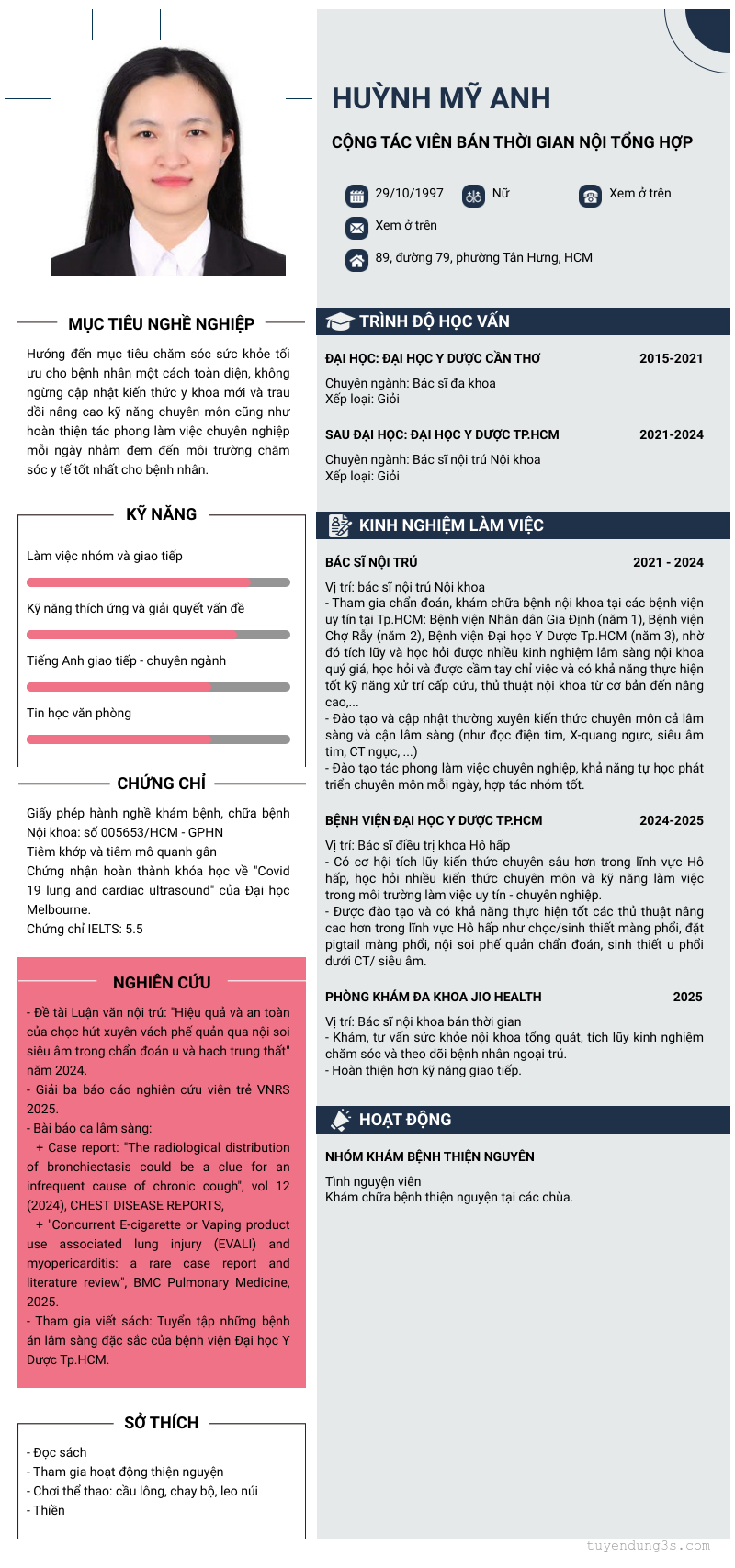 Mở xem thông tin đầy đủ ứng viên HUỲNH MỸ ANH chỉ với 2 điểm. Ứng viên được cập nhật ngày 30/09/2025