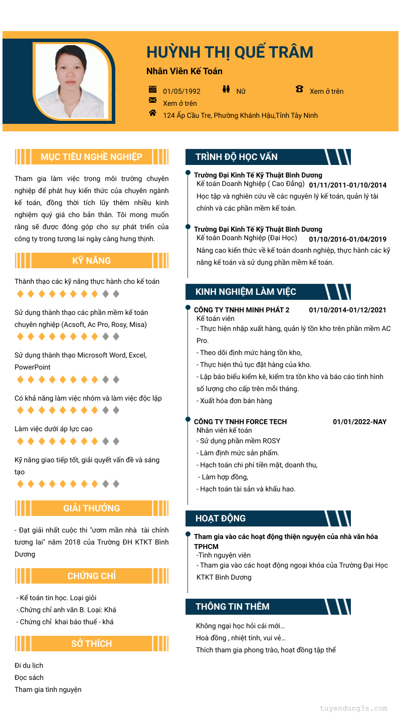 Nơi ở hiện tại: 124 Ấp Cầu Tre, Phường Khánh Hậu,Tỉnh Tây Ninh