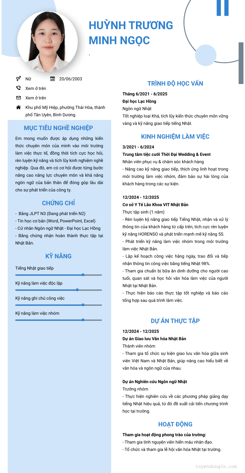 Mở xem thông tin đầy đủ ứng viên HUỲNH TRƯƠNG MINH NGỌC chỉ với 2 điểm. Ứng viên được cập nhật ngày 24/12/2025