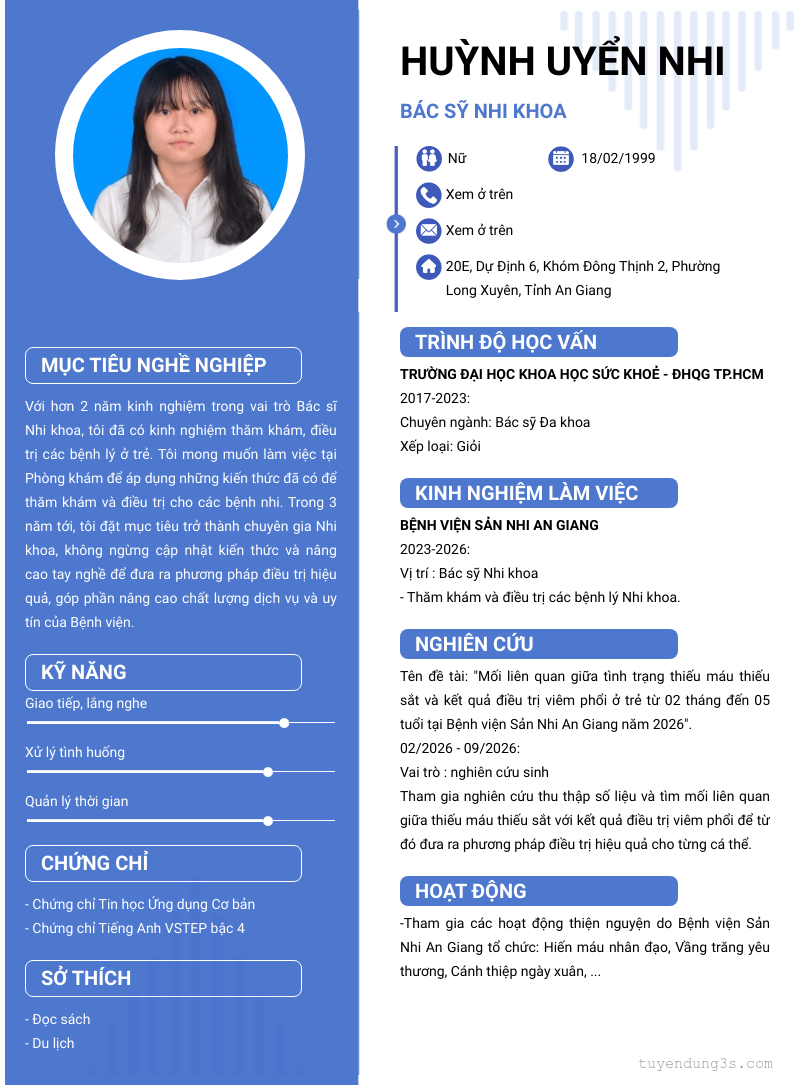 Mở xem thông tin đầy đủ ứng viên HUỲNH UYỂN NHI chỉ với 2 điểm. Ứng viên được cập nhật ngày 17/03/2026