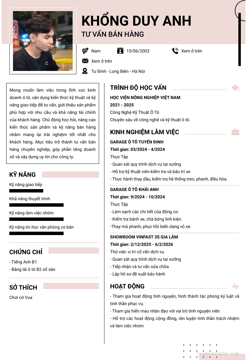 Mở xem thông tin đầy đủ ứng viên KHỔNG DUY AnH chỉ với 2 điểm. Ứng viên được cập nhật ngày 20/01/2026