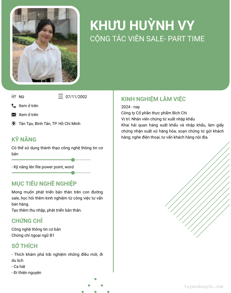 Mở xem thông tin đầy đủ ứng viên KHƯu Huỳnh Vy chỉ với 2 điểm. Ứng viên được cập nhật ngày 05/10/2025
