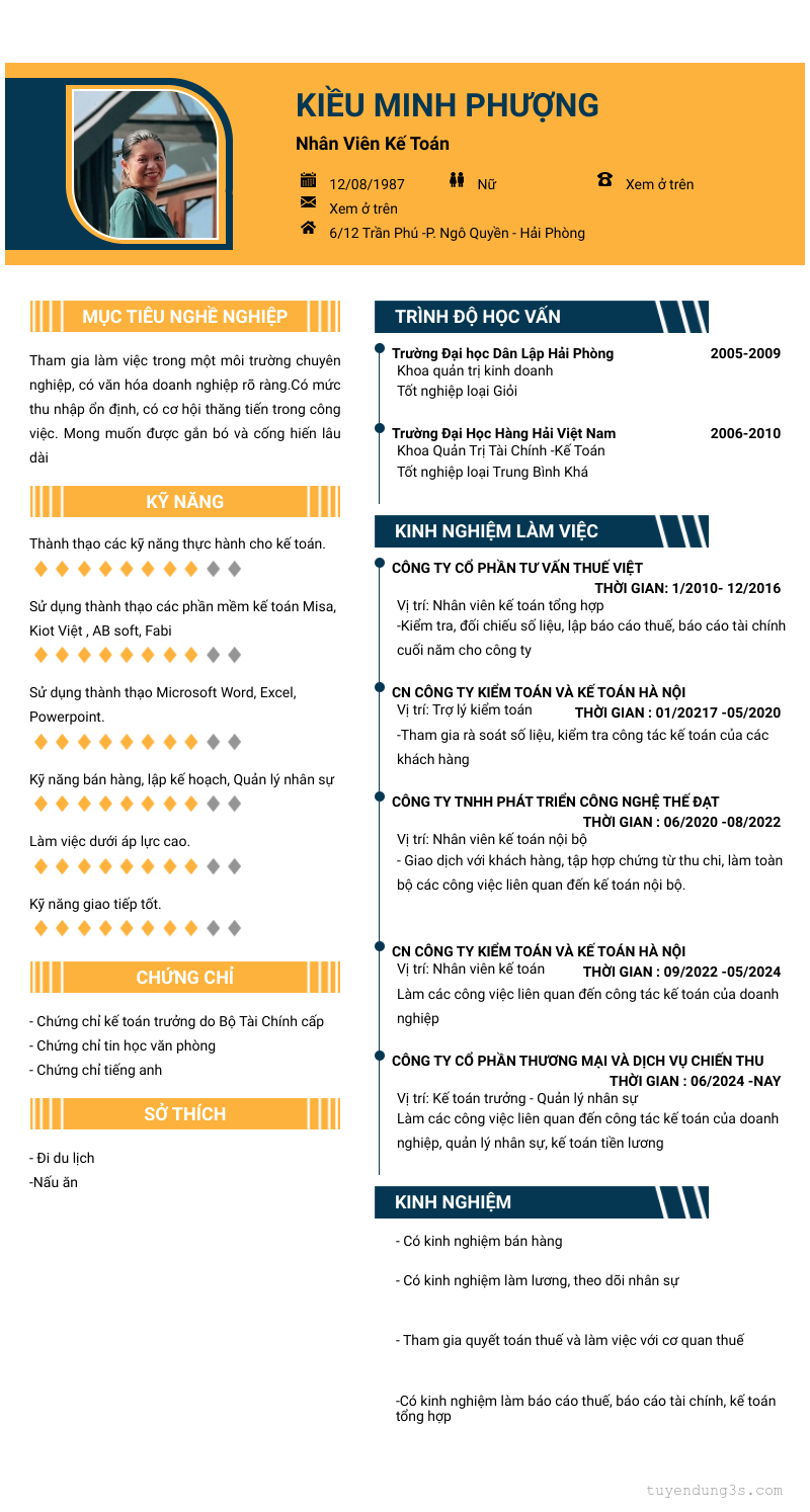 Mở xem thông tin đầy đủ ứng viên Kiều Minh Phượng chỉ với 2 điểm. Ứng viên được cập nhật ngày 30/09/2025