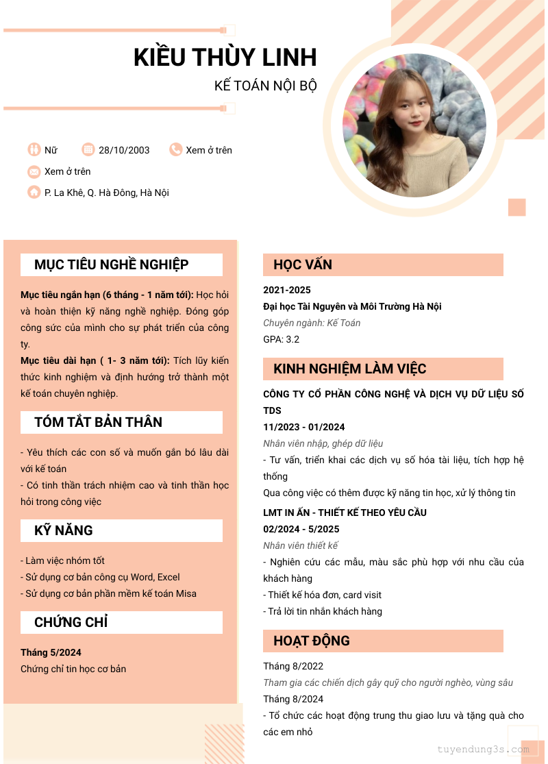 Mở xem thông tin đầy đủ ứng viên KIỀU THÙY LINH chỉ với 2 điểm. Ứng viên được cập nhật ngày 08/07/2025