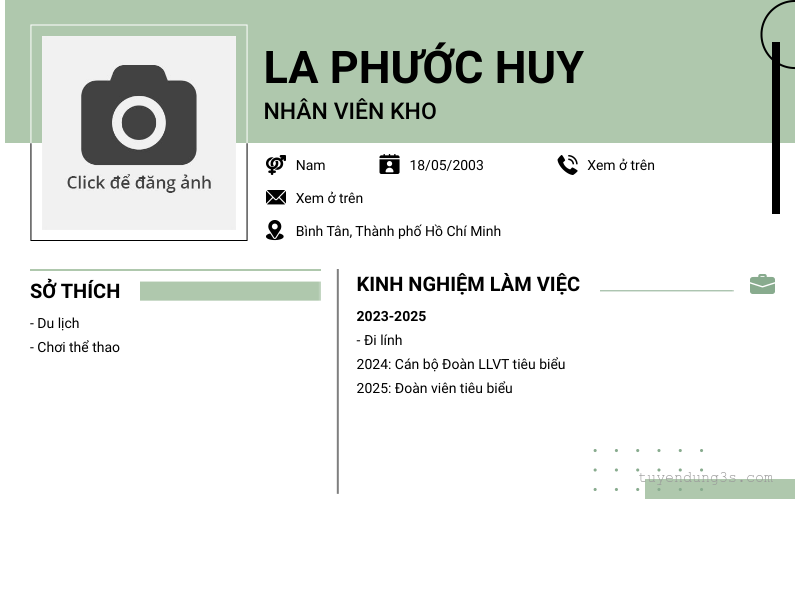 Mở xem thông tin đầy đủ ứng viên La Phước Huy chỉ với 2 điểm. Ứng viên được cập nhật ngày 18/10/2025