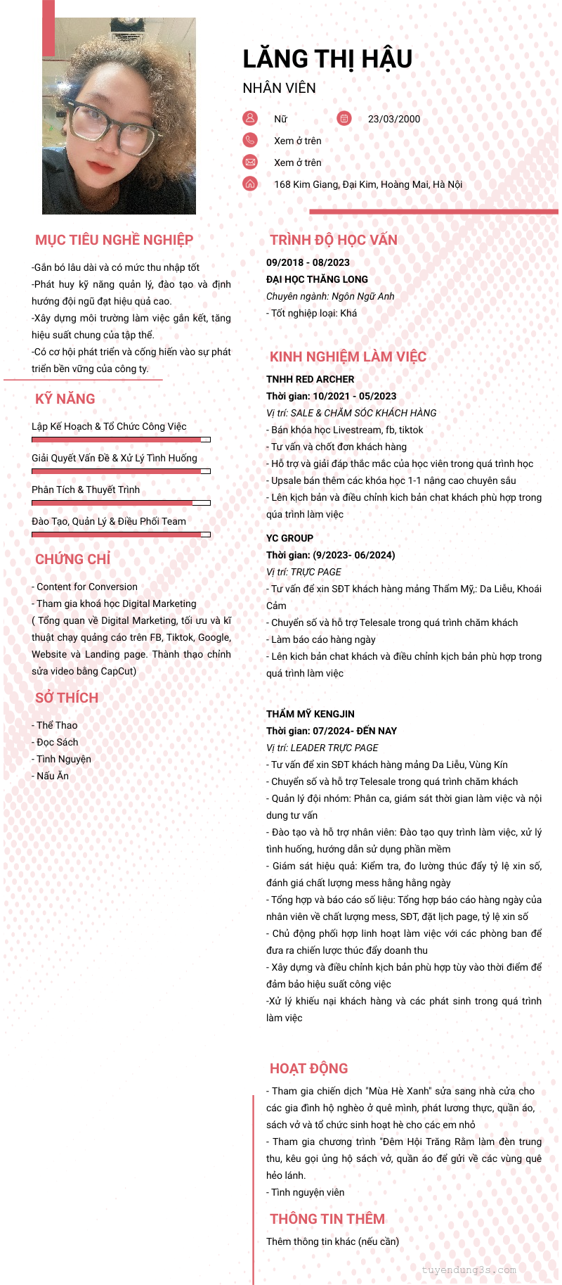 Mở xem thông tin đầy đủ ứng viên LĂNG THỊ HẬU chỉ với 2 điểm. Ứng viên được cập nhật ngày 24/09/2025