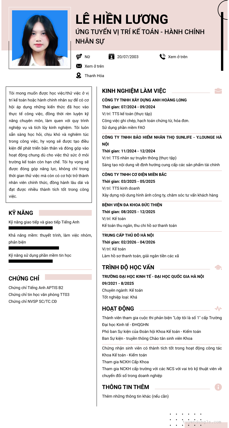 Mở xem thông tin đầy đủ ứng viên Lê Hiền Lương chỉ với 2 điểm. Ứng viên được cập nhật ngày 21/04/2026