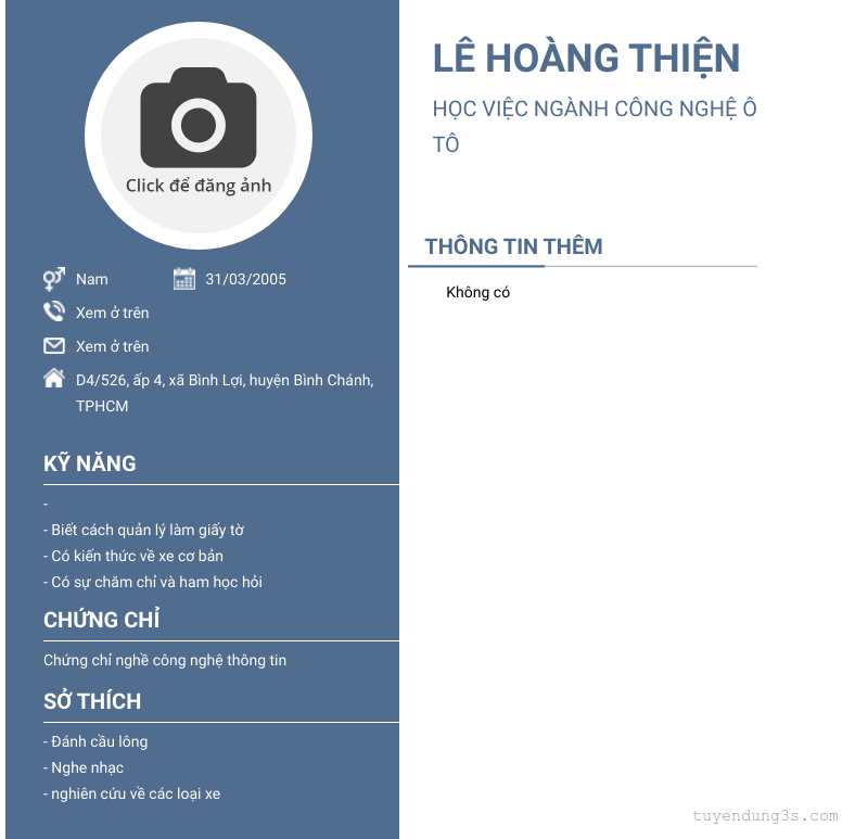 Nơi ở hiện tại: D4/526, ấp 4, xã Bình Lợi, huyện Bình Chánh, TPHCM
