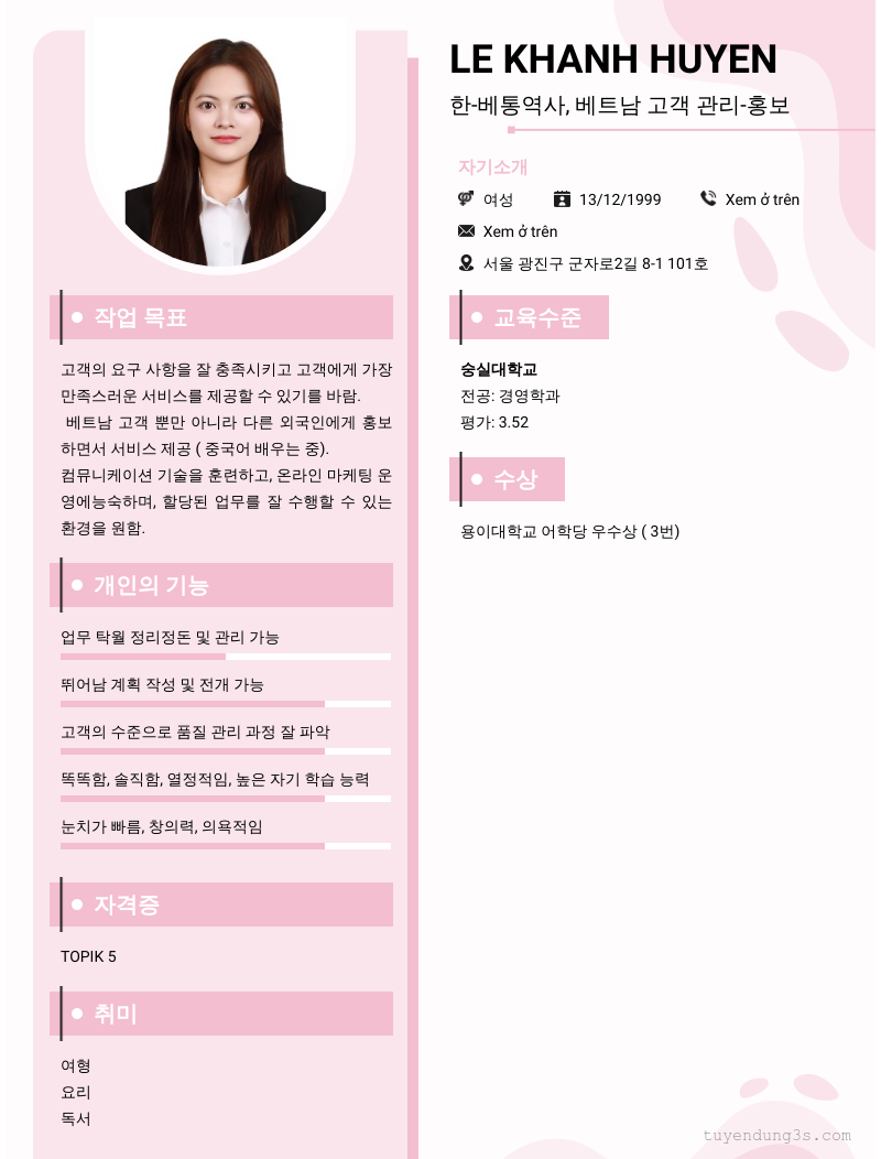 Mở xem thông tin đầy đủ ứng viên Le Khanh Huyen chỉ với 2 điểm. Ứng viên được cập nhật ngày 24/11/2025