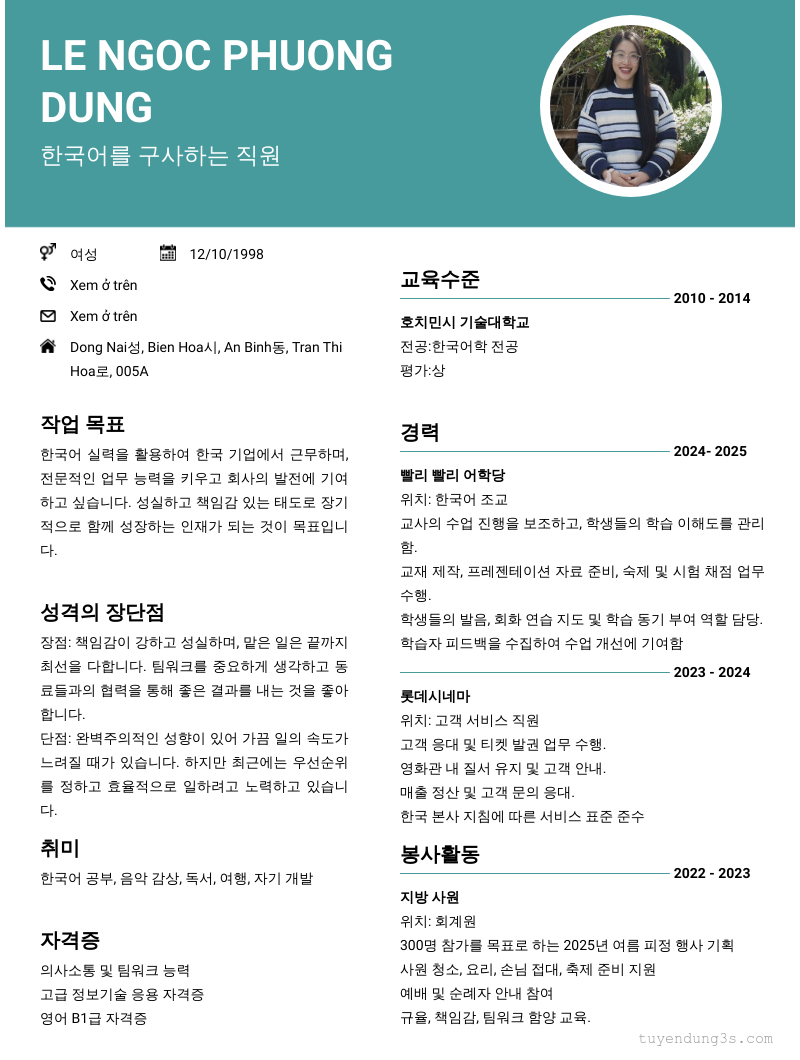 Mở xem thông tin đầy đủ ứng viên Le Ngoc Phuong Dung chỉ với 2 điểm. Ứng viên được cập nhật ngày 28/10/2025