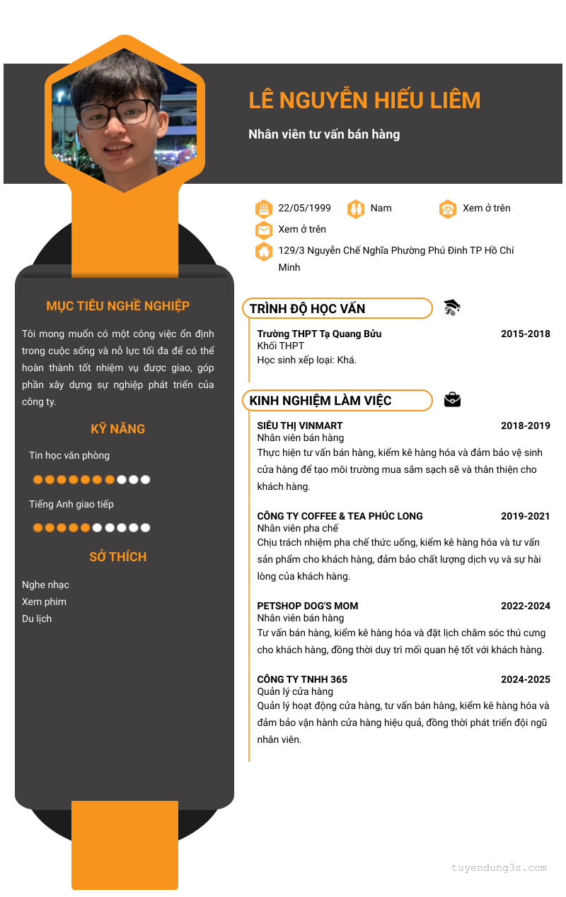 Nơi ở hiện tại: 129/3 Nguyễn Chế Nghĩa Phường Phú Đinh TP Hồ Chí Minh